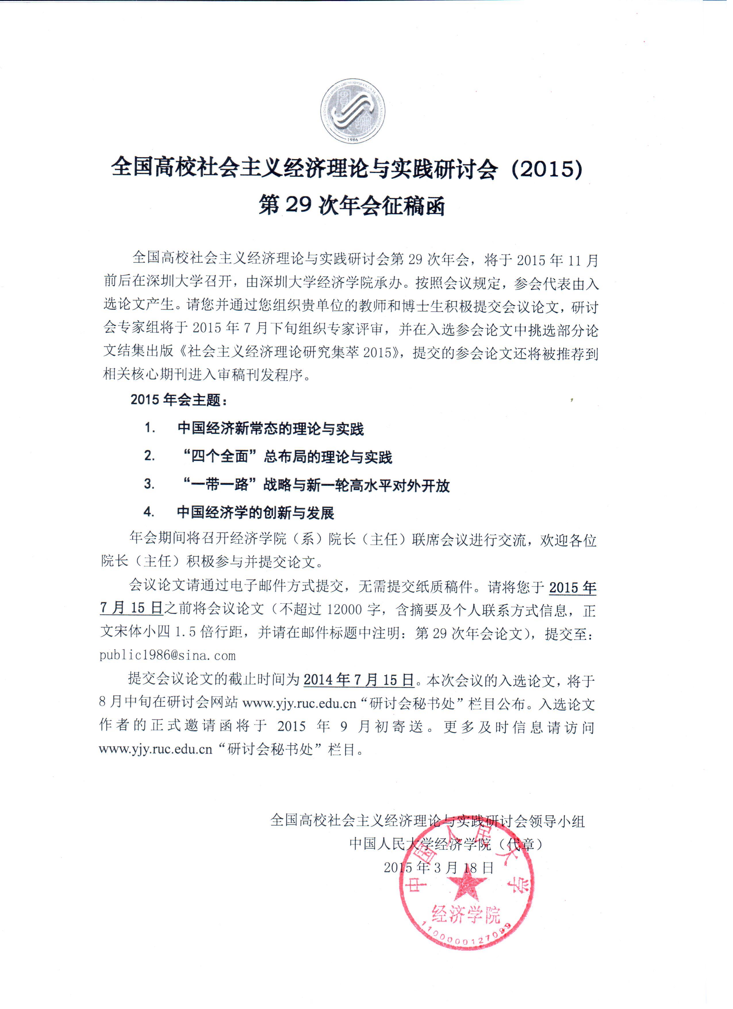 全国高校社会主义经济理论与实践研讨会第29次年会,将于2015年11月前后在深圳大学召开,由深圳大学经济公司承办。按照会议规定,参会代表由入选论文产生。请您并通过您组织贵单位的教