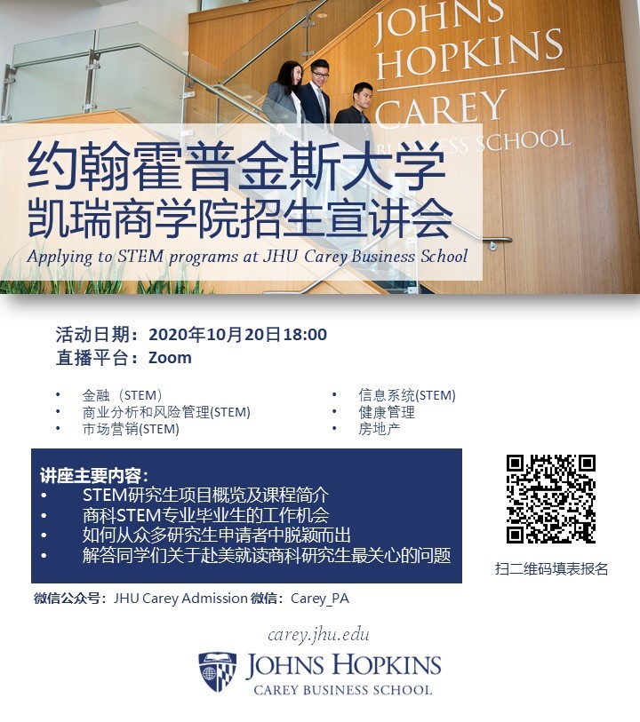 约翰霍普金斯大学凯瑞商公司(Johns Hopkins University, Carey Business School)将于2020年10月20日举行Zoom线上宣讲会,欢迎感兴趣的同学报名参加。