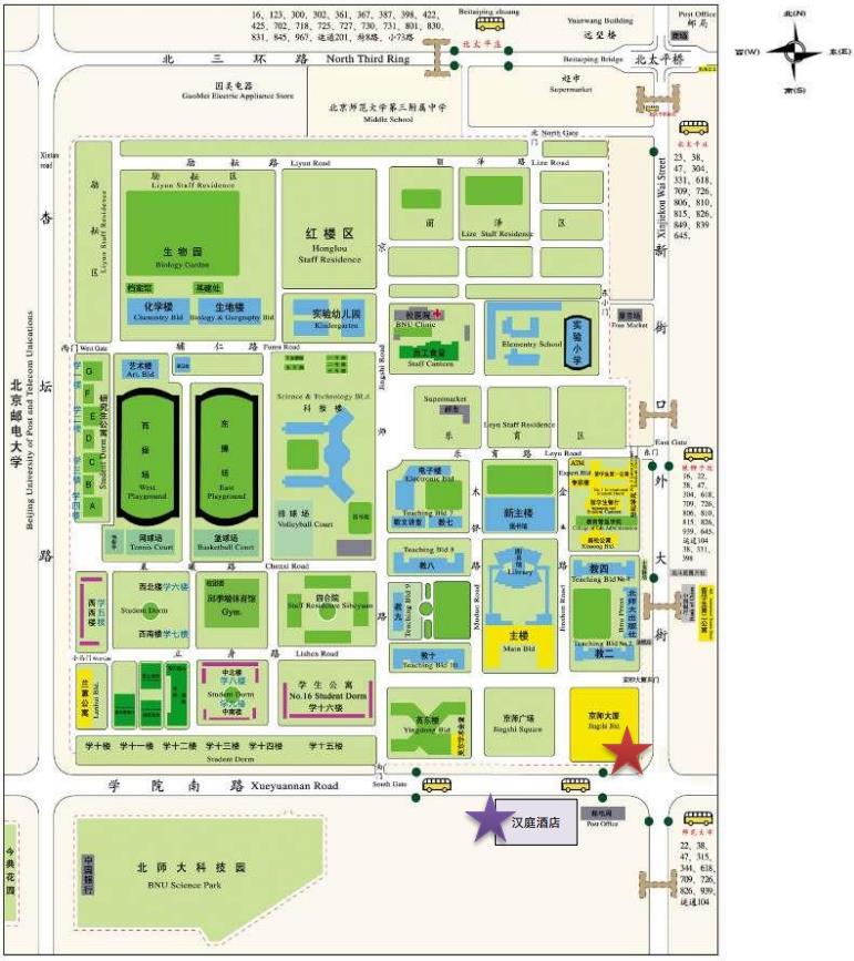 注:京师大厦位于北师大校园东南角(图上红色星) 汉庭酒店(积水潭店)位于北师大京师广场对面(图上紫色星)