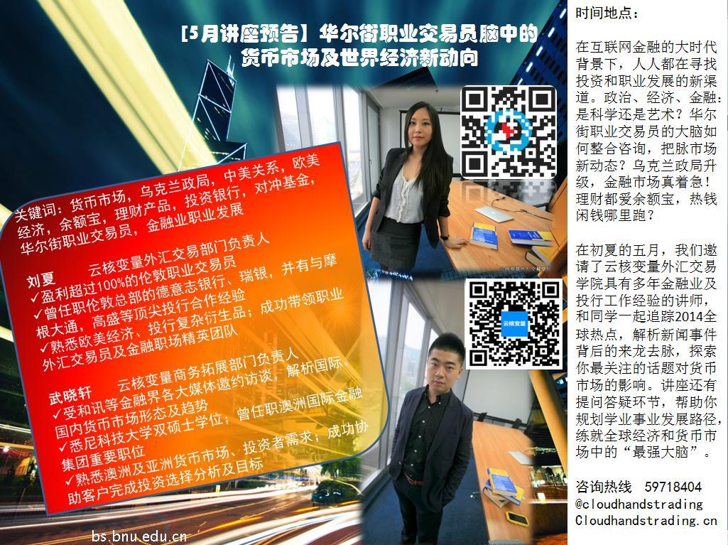货币市场,乌克兰政局,互联网金融,中美关系,欧美经济,人民币利率,余额宝,理财产品,投资银行,对冲基金,华尔街职业交易员,金融业职业发展在互联网金融的大时代背景下,人人都在寻找投资和职业发展的新渠道。政治、经济、金融:是科学还是艺术?华尔街职业交易员的大脑如何整合咨询,把脉市场新动态?乌克兰政局升级,金融市场真着急!理财都爱余额宝,热钱闲钱哪里跑?在初夏的五月,我们邀请了云核变量外汇交易公司具有多年金融业及投行工作经验的讲师,和同学一起追踪2014全球热点,解析新闻事件背后的来龙去脉,探索你最关注的话题对货币市场的影响。讲座还有提问答疑环节,帮助你规划学业事业发展路径,练就全球经济和货币市场中的“最强大脑”。