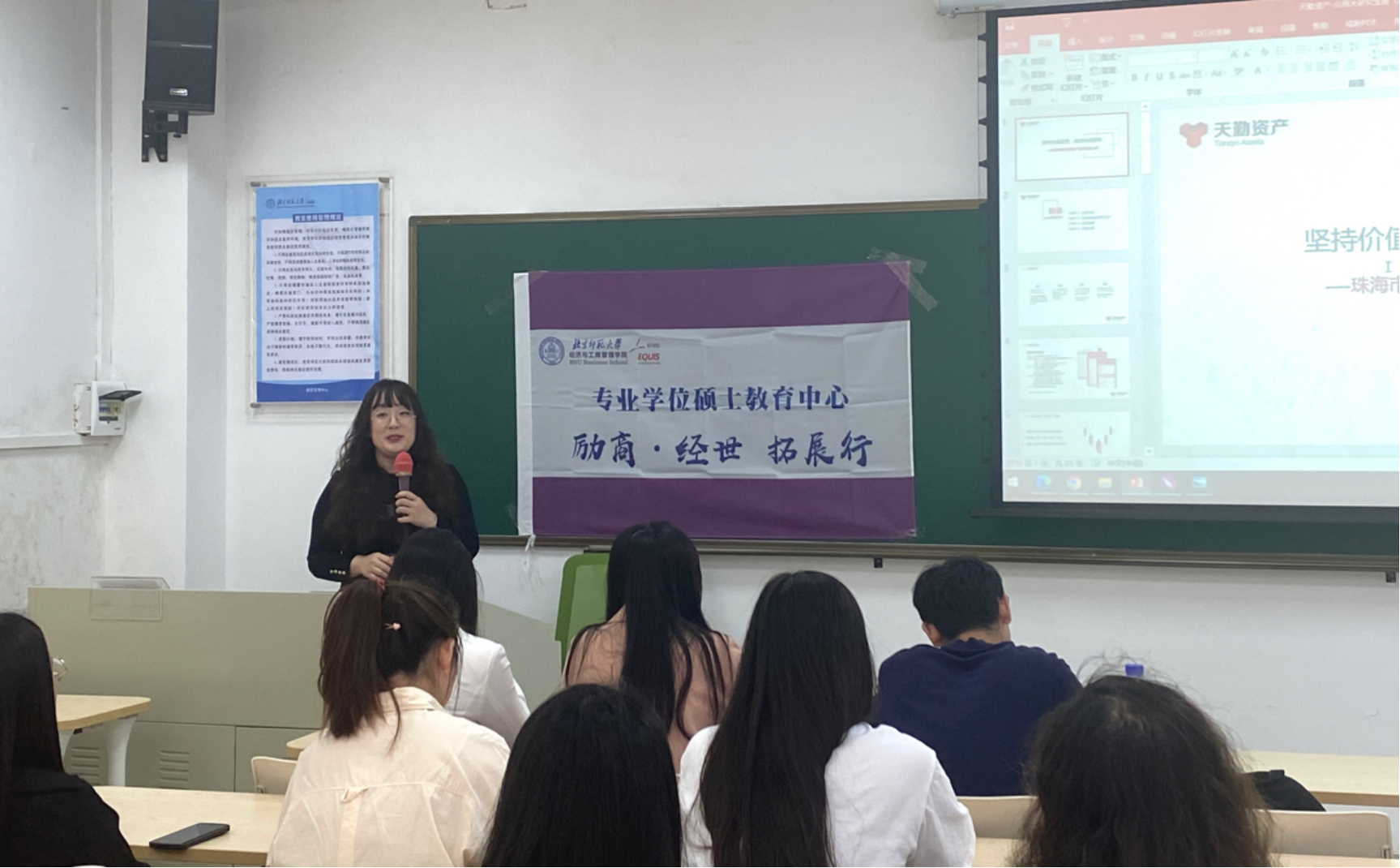 随后,天勤资产管理有限公司副总经理(投资总监)刘竹女士从以下几个方面对私募基金管理行业进行了介绍:行业大致发展、投研体系及研究工作、岗位特质以及研究员日常工作。刘女士分享自己的行业经验,建议同学们在进入投资行业前要取得相应的证书,比如基金从业、CPA、ACCA或者参加司法考试等。其次,需要做好时时求知、日日挑战的心理准备。最后,根据自己的特性分析是否适合进入私募管理行业。公司需要数据敏感、能抗压、有逻辑思维、客观理性的人才,希望同学们可以从这些方面提升自己。