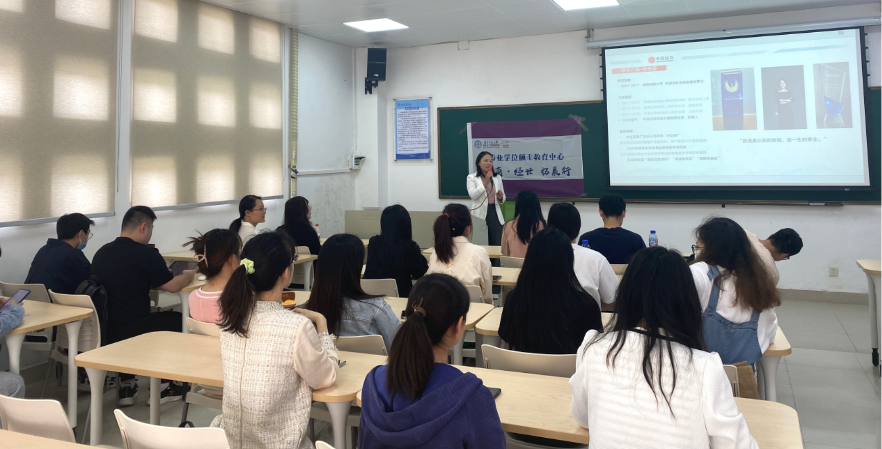 3月17日yl88858永利集团专业学位硕士教育中心举办励商·经世·拓展行系列活动,邀请校外导师中信证券华南股份有限公司珠海文园路证券营业部总经理张胜蓝老师,及珠海市横琴天勤资产管理有限公司副总经理(投资总监)刘竹女士,为2022级专业学位硕士研究生进行就业指导。