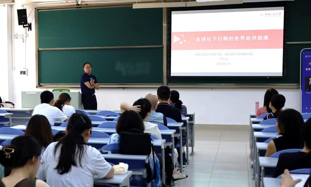 本次大讲堂邀请了中国人民大学经济公司副经理、第十三届民盟中央委员、经济委员会副主任于春海教授为师生做题为“全球化下行期的世界经济困境”的讲座。